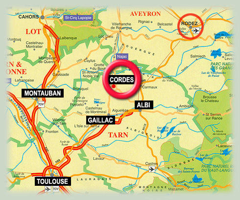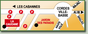 LES DIFFERENTS MOYENS DE SE RENDRE A CORDES SUR CIEL PAR AIR: Vous pouvez accéder à Cordes par voie aérienne à partir de nombreuses aéroports régionaux en atterrissant à l’aéroport de Rodez mais principalement à l’aéroports de Toulouse. A partir de Toulouse il faut compter environ une heure et vingt minutes en voiture. Une autre possibilité est de prendre un autobus de Toulouse à Albi où il est possible de venir vous chercher (mais c’est à organiser à l’avance pour ceux qui viendraient à « La Gaudane » sans moyen ni vouloir se déplacer ensuite. Une organisation qu’il est possible de monter à partir des deux aéroports en minibus dans le cas de groupes et sur demande. On peut aussi arriver de l'aéroport de Carcassonne, un trajet d'environ 2 heures. PAR LA ROUTE: « La Gaudane » et Cordes sont accessibles par route, une bonne carte et un GPS valent mieux que toute explication. A savoir cependant qu’en arrivant par le Sud, Carcassonne ou Toulouse puis Albi, la route sera moins sinueuse, ce qui sera appréciable après un long parcours. En arrivant par le Nord, et via Limoges, Clermont-Ferrant, Saint Etienne, on rencontrera des routes plus belles mais sinueuse, prudence en fin de parcours. Montauban, vous aurez le choix, entre le sud et le nord, le calme récupérateur ou la beauté sinueuse. A parir de Strasbourg 950km/9h30mn, de Nantes 614km/6h30mn, de Paris 659km/6h30mn, de Lyon 420km/6h00, de Marseille 485km/4h40mn, Boulogne sur mer 922km/8h50. Certains choisirons de faire le parcours en une journée d’autres de s’arrêter et d’entrer en douceur et prudence dans leurs vacances, visitant au passages d’autres beaux lieux. PAR LE TRAIN: Montauban et Toulouse sont sur les réseaux Grandes lignes et reliées entre autres à Paris. Il y a une petite station à Cordes, la station Cordes-Vindrac reliée aux stations d'Albi et de Toulouse, pour se mettre au rythme des vacances. CONSEIL POUR LES VISITES TOURISTIQUES: Bien que les distances soient courtes, une voiture est recommandée pour un séjour à La Gaudane ; Il y a tellement de choses à voir et à faire dans le Tarn. Les routes sont sinueuses, et les pentes fréquentes, dans les villages comme dans les villes, les ruelles étroites et encore pavés car souvent conservées imposent de pouvoir se garer car elles sont très animés l’été. FACILE A TROUVER: Cordes est marqué dés l'autoroute Toulouse au niveau de la sortie 9 et facile à trouver au niveau de la A20, juste au nord de Montauban. La Gaudane est facilement accessible par la basse-ville comme par le vieux centre Cordes comme nous le montrons ci-dessous. Ne pas se perdre dans Cordes, c'est possible avec les explications qui suivent:
